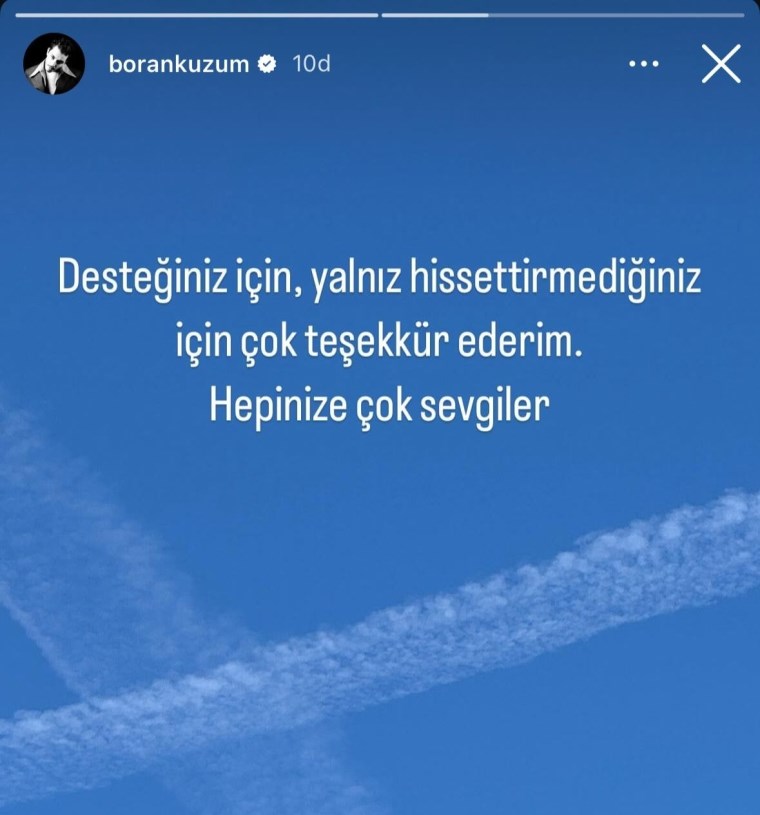 Boran Kuzum, geçtiğimiz günlerde Aybüke Pusat’a verdiği destekle gündeme gelmişti. Pusat, boykot paylaşımı yaptığı için TRT’nin Teşkilat dizisinden çıkarılmıştı. Oyuncu Kuzum, sosyal medya hesabından Pusat’ı paylaşarak “Canım, güzel insan” şeklinde bir mesaj yazmıştı.