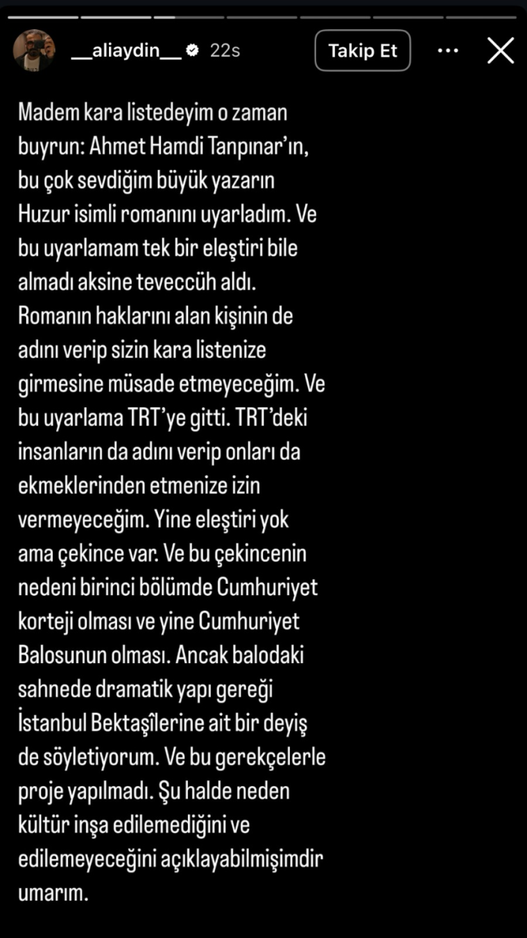 Ali Aydın, TRT tarafından iptal edilen projesine dair, “Ahmet Hamdi Tanpınar’ın Huzur isimli romanını uyarladım. Uyarlama TRT’ye gitti. Yine eleştiri yok çekince var. Bu çekincenin nedeni birinci bölümde Cumhuriyet korteji olması ve Cumhuriyet Balosunun olması.” dedi.