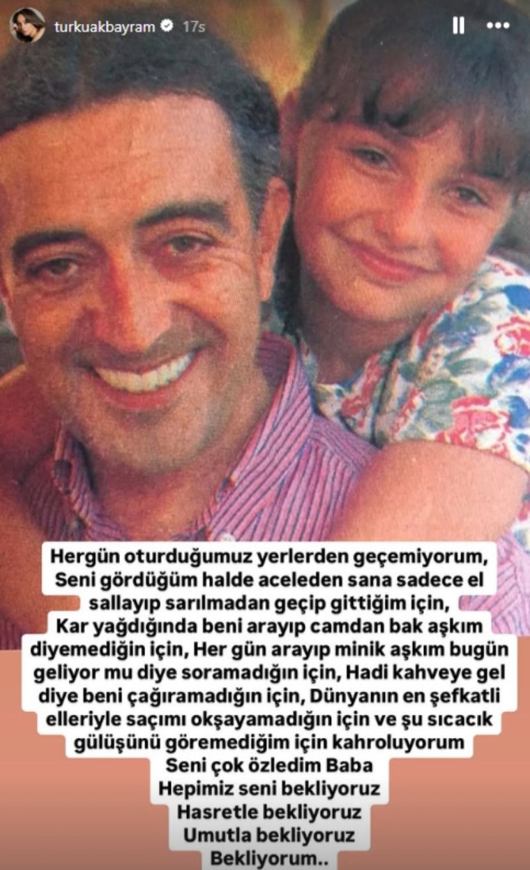 Türkü Akbayram, “Her gün oturduğumuz yerlerden geçemiyorum. Seni gördüğüm halde aceleden sana sadece el sallayıp sarılmadan geçip gittiğim için… Kar yağdığında beni arayıp ‘camdan bak aşkım’ diyemediğin için… Her gün arayıp ‘minik aşkım bugün geliyor mu?’ diye soramadığın için… ‘Hadi kahveye gel’ diye beni çağıramadığın için… Dünyanın en şefkatli elleriyle saçımı okşayamadığın için ve şu sıcacık gülüşünü göremediğim için kahroluyorum. Seni çok özledim baba. Hepimiz seni bekliyoruz. Hasretle bekliyoruz. Umutla bekliyoruz. Bekliyorum” ifadelerini kullandı.
