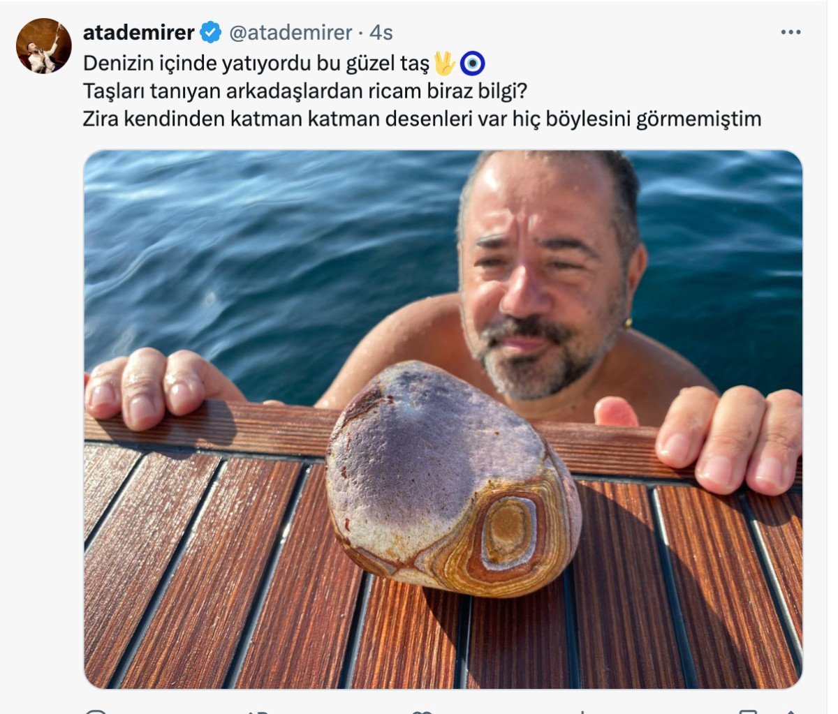 Paylaşımında taşın üzerindeki katmanlı desenlerin dikkatini çektiğini belirten komedyen “Denizin içinde yatıyordu bu güzel taş. Taşları tanıyan arkadaşlardan ricam biraz bilgi? Zira kendinden katman katman desenleri var hiç böylesini görmemiştim.” dedi.
