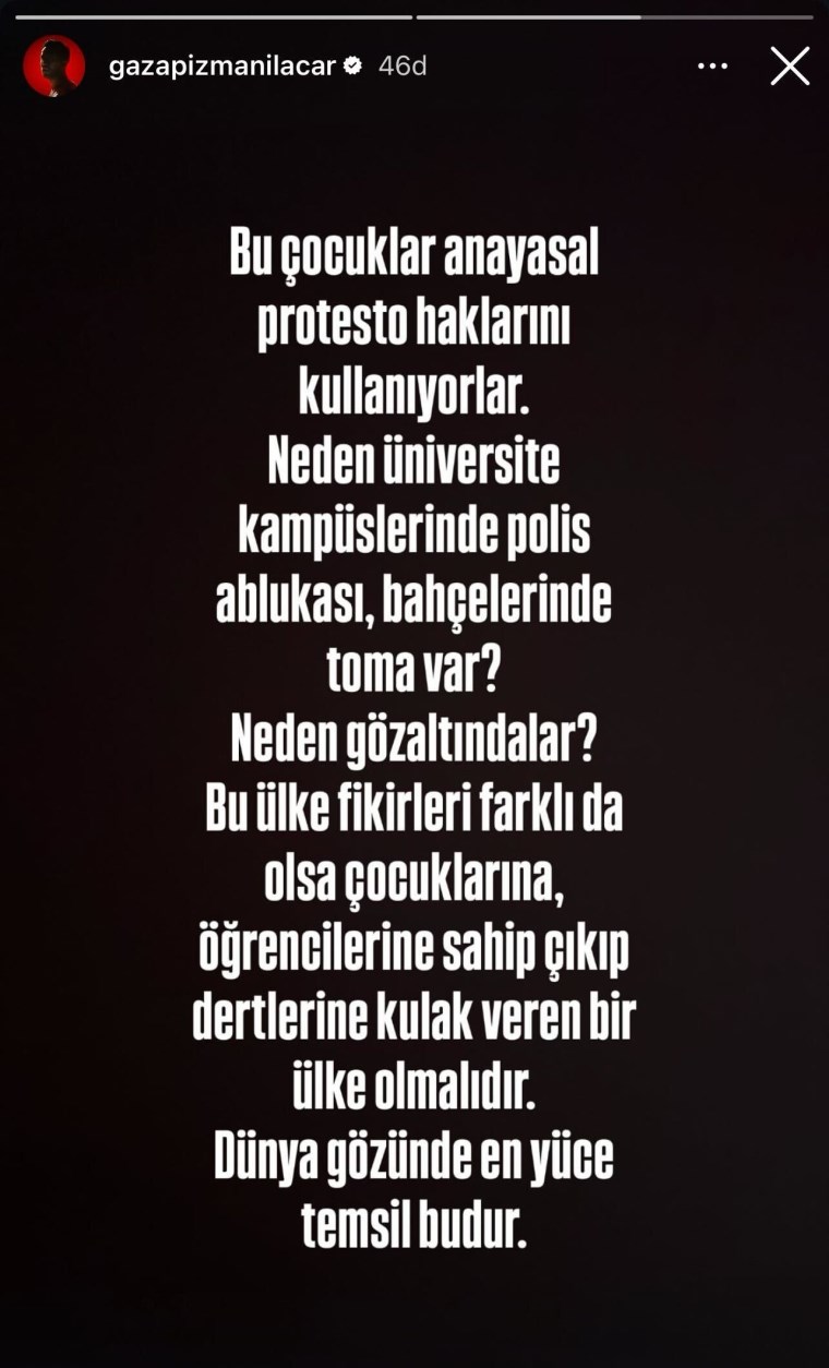 Instagram hesabından bir paylaşım yapan ünlü rapçi, “Bu çocuklar anayasal protesto haklarını kullanıyorlar. Neden üniversite kampüslerinde polis ablukası, bahçelerinde TOMA var? Neden gözaltındalar? Bu ülke fikirleri farklı da olsa çocuklarına, öğrencilerine sahip çıkıp dertlerine kulak veren bir ülke olmalıdır. Dünya gözünde en yüce temsil budur” dedi.