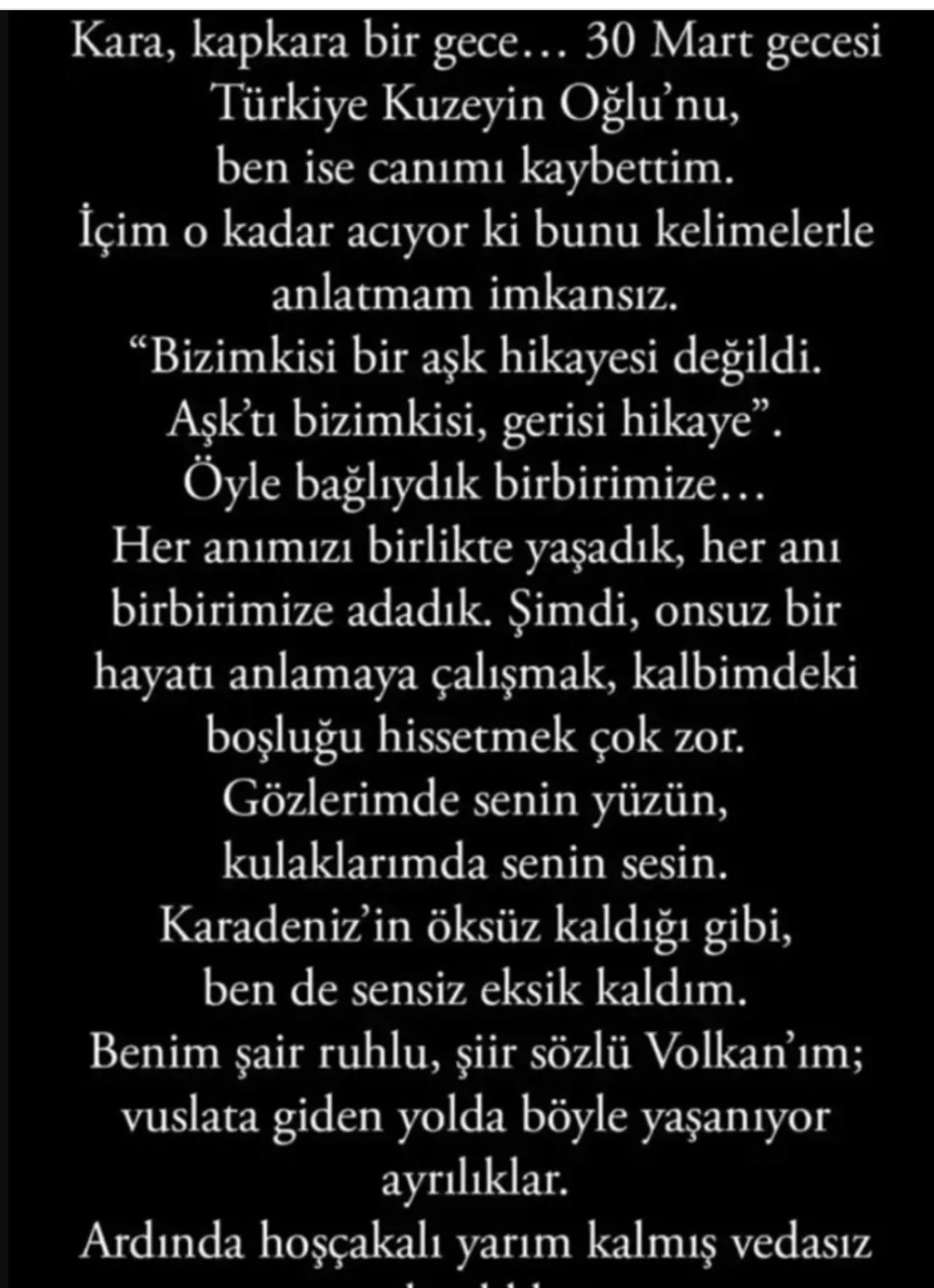 Şimdi onsuz bir hayatı anlamaya çalışmak, kalbimdeki boşluğu hissetmek çok zor. Gözlerimde senin yüzün, kulaklarımda senin sesin… Karadeniz’in öksüz kaldığı gibi ben de sensiz eksik kaldım. Benim şair ruhlu, şiir sözlü Volkan’ım… Vuslata giden yolda böyle yaşanıyor ayrılıklar… Ardında hoşçakalı yarım kalmış vedasız yalnızlıklar…Yeniden kavuşacağımız güne dek!”