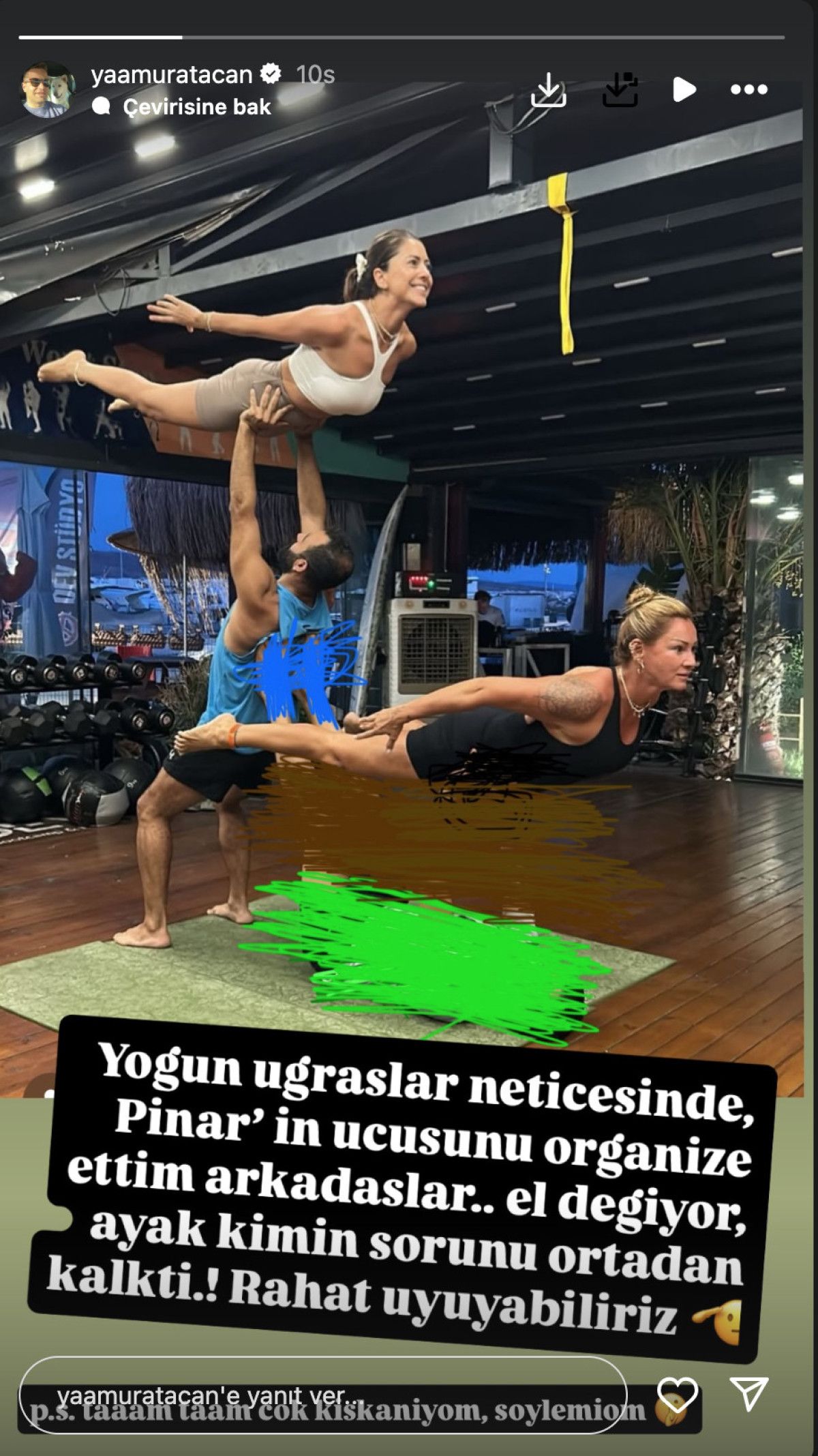 Atacan, şimdi de eşinin yeni yoga pozlarını paylaştı. Sosyal medyadaki yorumları ti’ye alan Yağmur Atacan karısını kaldıran kişiyi fotoğrafta karalayarak “Yoğun uğraşlar neticesinde Pınar’ın uçuşunu organize ettim” dedi.