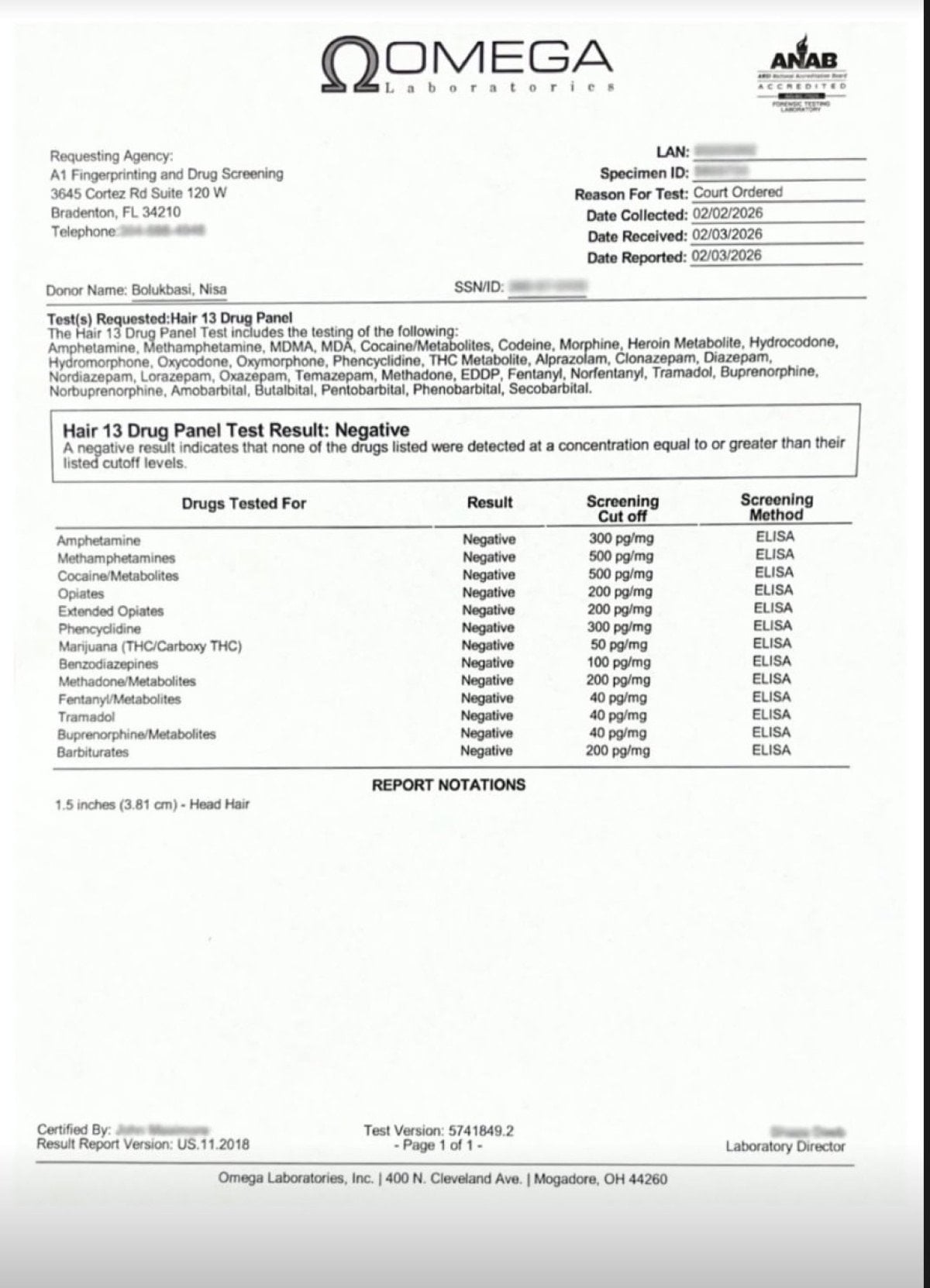 “Bir süredir Amerika Birleşik Devletleri’nde yaşamını sürdüren müvekkilimiz, vatandaşlık prosedürleri sebebiyle yakın tarihte ülkemize seyahat edemeyecekse de; 02/02/2026 tarihinde ABD’de akredite bir laboratuvarda saç örneğinden 13 panel uyuşturucu/uyarıcı madde tarama testi yaptırmış olup, 03/02/2026 tarihli raporda tüm sonuçların negatif olduğu tespit edilmiştir.