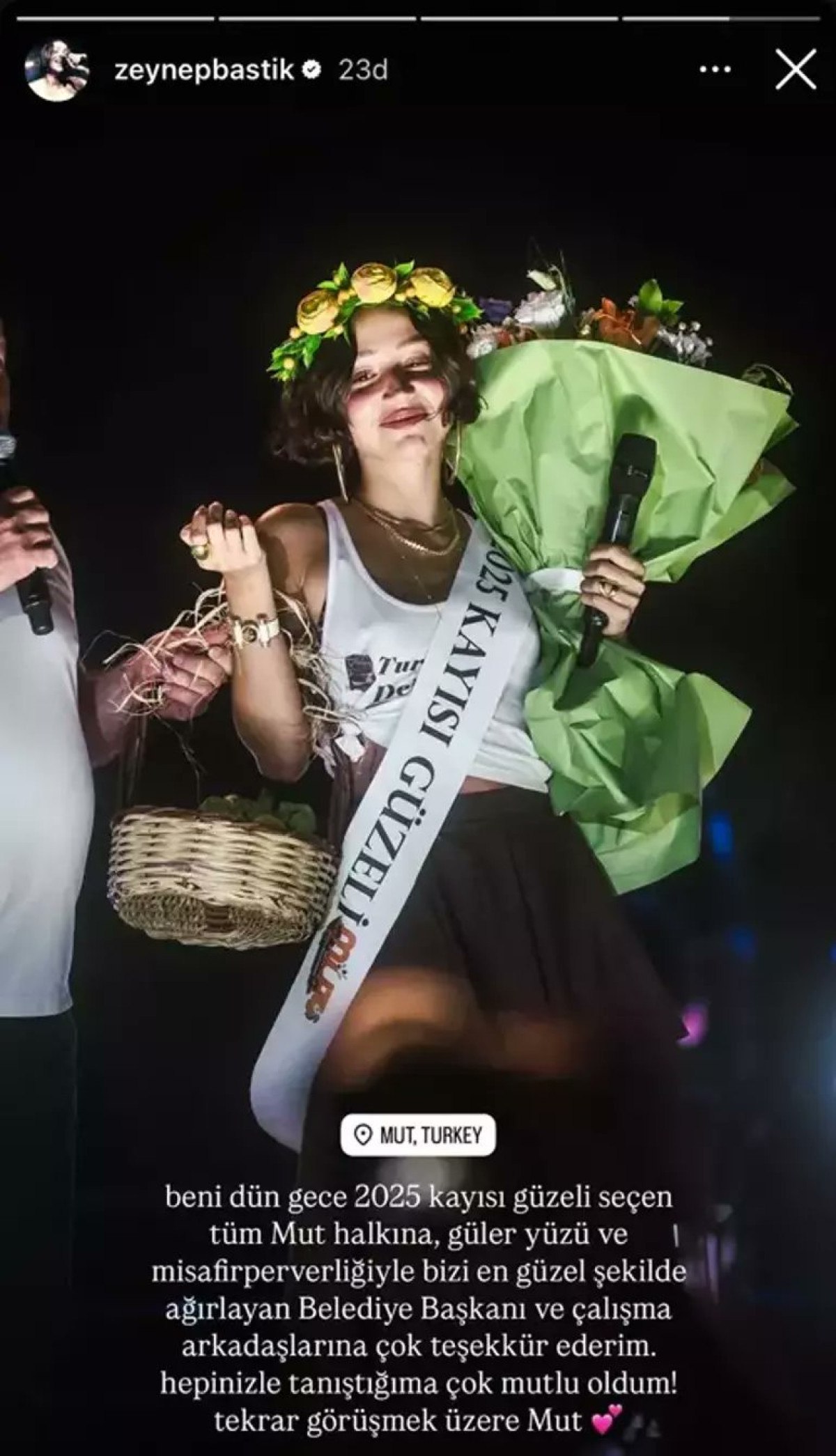 Bastık bu defa da “2025 Kayısı Güzeli” seçildi. Instagram hesabından paylaşım yapan ünlü şarkıcı şu ifadeleri kullandı: “Beni dün gece 2025 kayısı güzeli seçen halka ve güzel yüzlü ve misafirperverliğiyle bizi en güzel şekilde ağırlayan belediye başkanı ve çalışma arkadaşlarına çok teşekkür ederim. Hepinizle tanıştığıma çok mutlu oldum.”