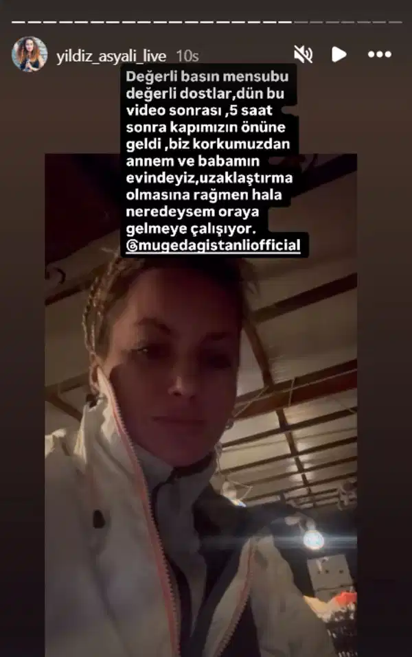 “Değerli basın mensupları, değerli dostlar… Dün bu video sonrası, yaklaşık 5 saat sonra kapımızın önüne geldi. Korkumuzdan annem ve babamın evindeyiz. Uzaklaştırma kararı olmasına rağmen hâlâ neredeysem oraya gelmeye çalışıyor.”