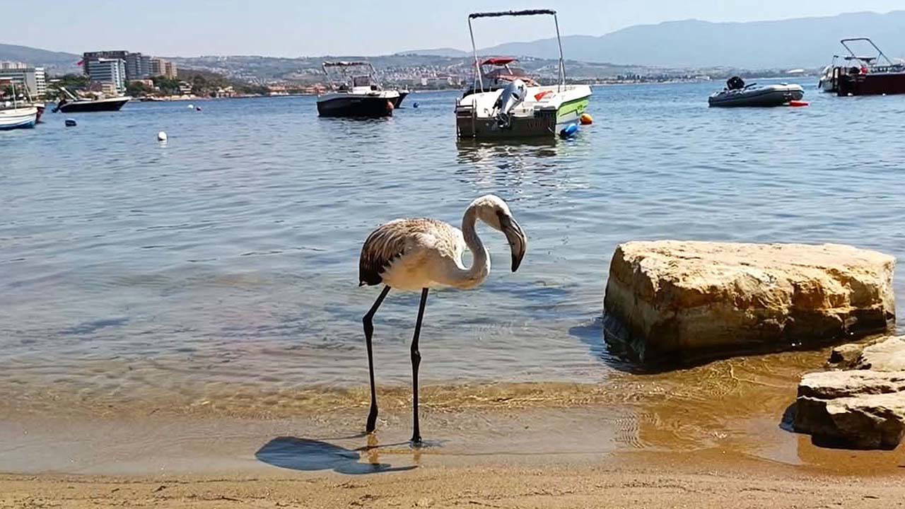 Öte yandan Kuşadası’nda bir otel işletmesinin plajına da flamingo yavrusu indi.