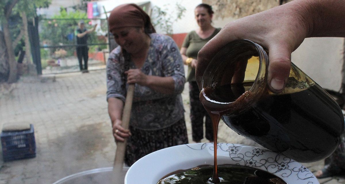 Uzun uğraşlar ile hiçbir katkı maddesi kullanılmadan hazırlanan pekmezin el becerisi gerektirdiğini anlatan Medine Turgut, “Uzun uğraş ve zahmetler sonucu el işçiliği ile tamamen doğal yollardan hiçbir katkı maddesi kullanılmadan üretilen pekmezlerimiz kış mevsiminde her derde deva olarak kullanılır. Dutlar kazanda kaynatılır, şırası elde edilir. Kaynatma işlemi uzun süre uygulanır. Kaynatma işlemi açık yayvan kaplarda yapılır ve düşük ısıda koyulaşıncaya kadar kaynatılır. Kaynatma kazanında şıra kaynamaya başlayınca oluşan köpükler kepçe ile alınır. Kaynama ilerledikçe şıranın üstü sarı köpük bağlar, şıra içten içe kızarır, göz göz olarak kaynar ve pekmez kokusunu yayar” diye konuştu.