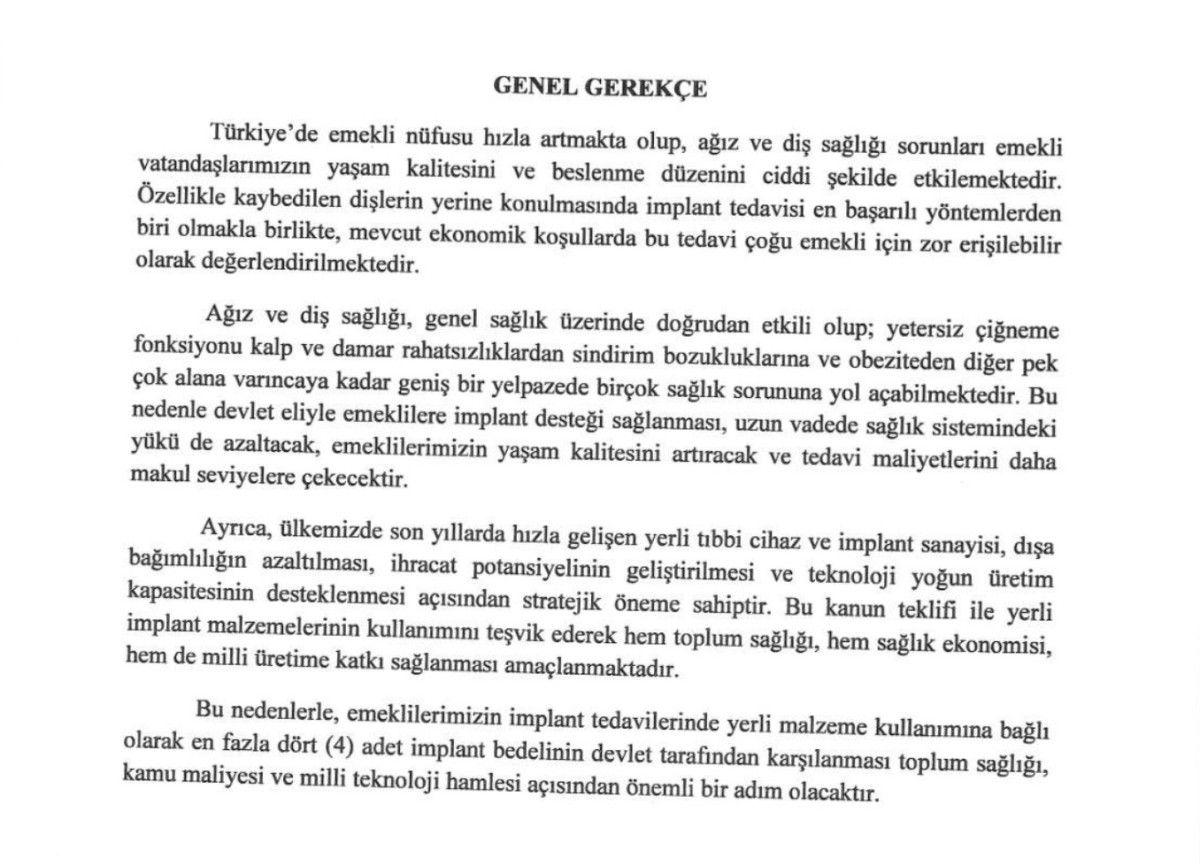 MHP Kayseri Milletvekili İsmail Özdemir’in sunduğu teklifle yerli üretim olmak şartı ile ve 4 adetten fazla olmamak üzere implant tedavilerinin SSK kapsamına alınması önerildi.