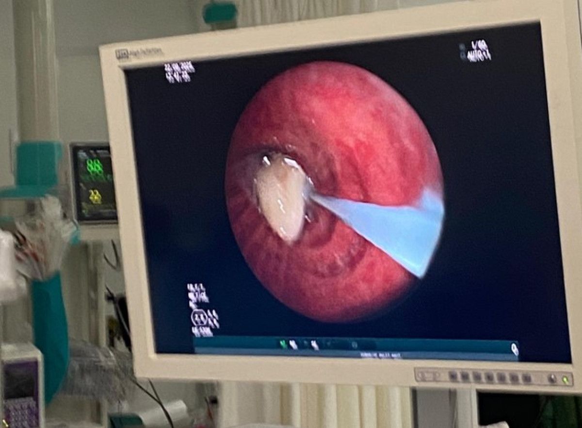 Hastanemize nefes darlığı ve morarma şikayetiyle gelen hastanın tomografisinde sol akciğerde tıkanıklık saptandı. Fleksibl bronkoskopi ile yapılan incelemede yabancı cisim bulundu ve başarılı bir şekilde çıkarıldı. Hastamız şu an sağlıklı durumda.