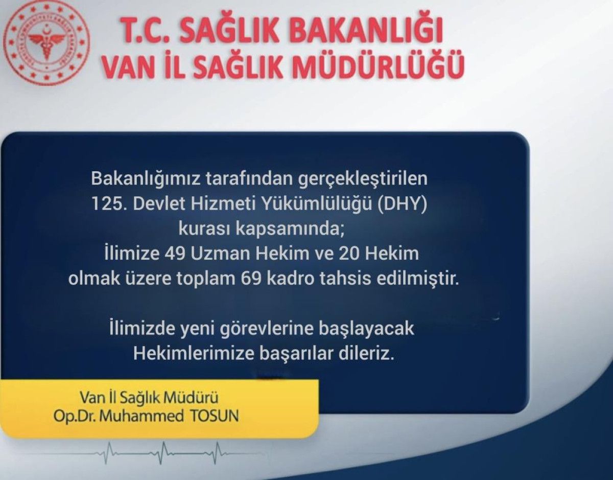 Sağlık Bakanlığı tarafından gerçekleştirilen 125. Devlet Hizmeti Yükümlülüğü (DHY) Kurası kapsamında, Van iline 49 uzman hekim ve 20 pratisyen hekim olmak üzere toplam 69 yeni kadro tahsis edildi.
