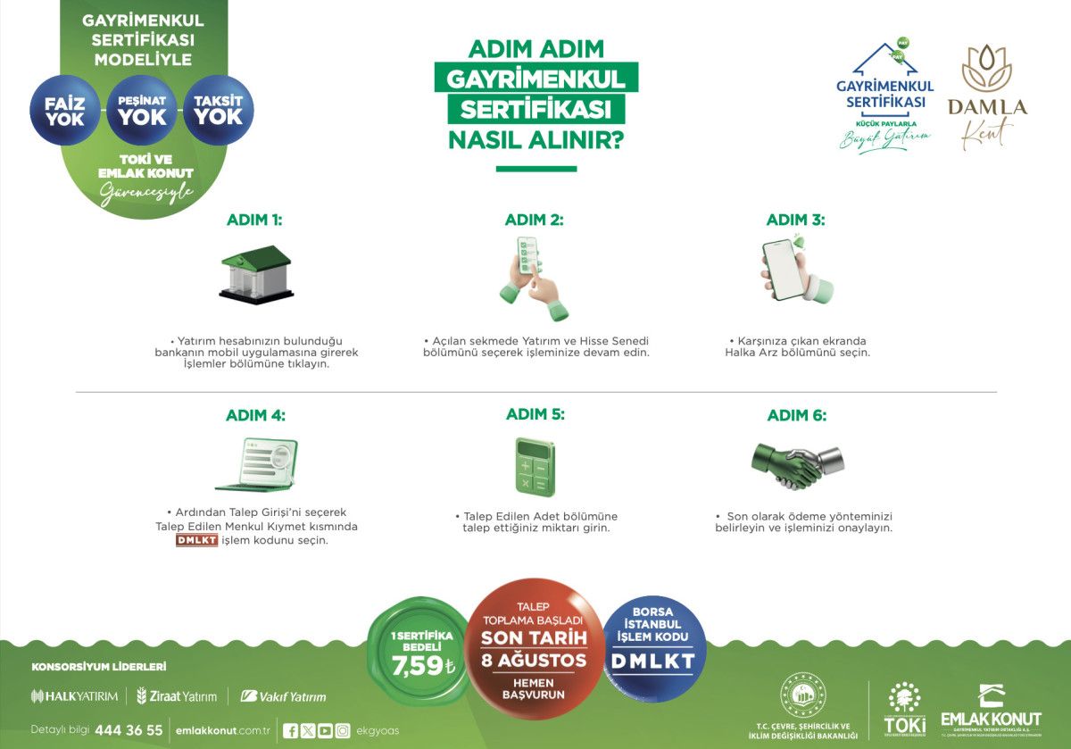 Çevre, Şehircilik ve İklim Değişikliği Bakanlığı koordinasyonunda, TOKİ ve Emlak Konut iş birliğiyle İstanbul Başakşehir’de hayata geçirilen Damla Kent projesine ait Gayrimenkul Sertifikası’nda talep toplama süreci yarın (8 Ağustos) sona eriyor.