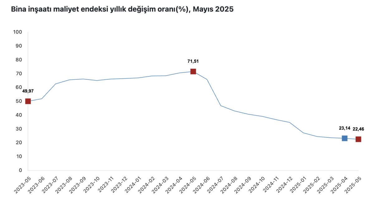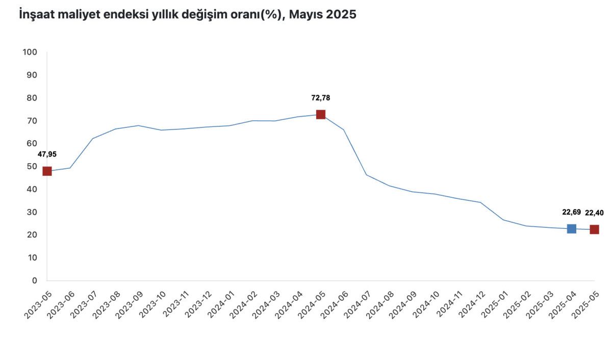 İnşaat maliyet endeksi 2025 yılı Mayıs ayında, bir önceki aya göre yüzde 0,88 arttı, bir önceki yılın aynı ayına göre yüzde 22,40 arttı.