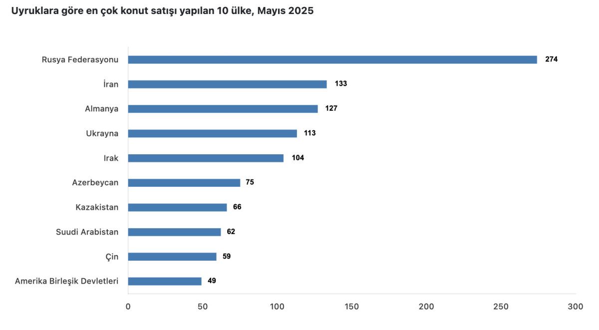 Mayıs ayında ülke uyruklarına göre en fazla konut satışı sırasıyla 274 ile Rusya Federasyonu, 133 ile İran ve 127 ile Almanya vatandaşlarına yapıldı.