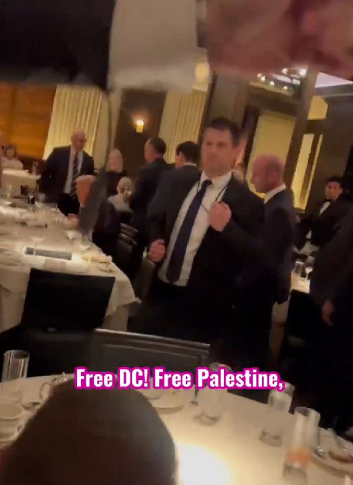Protestoyu gerçekleştiren göstericiler restorandan çıkarılırken Filistin ve Gazze lehine sloganlar atmaya devam ettiler.