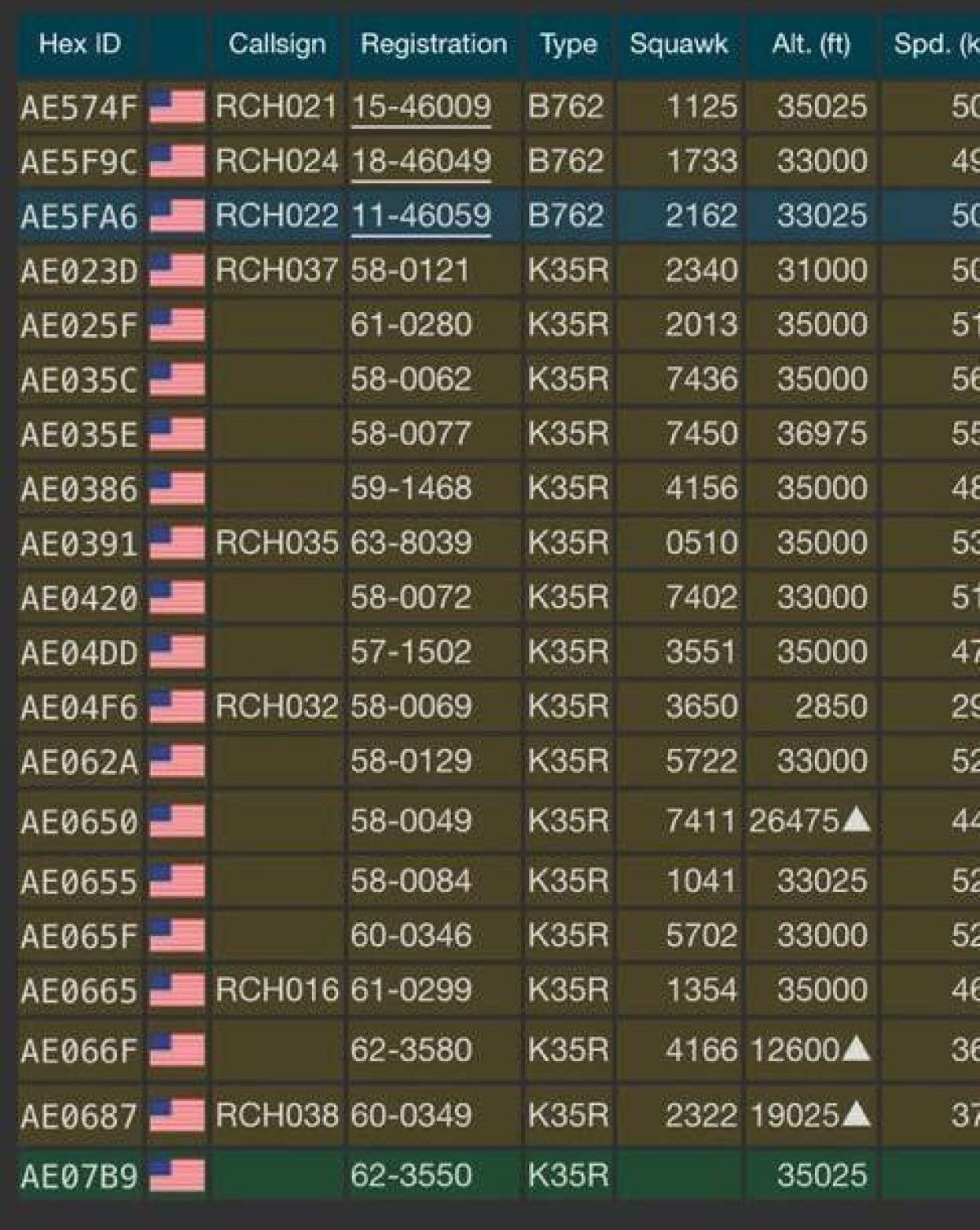 Görüntü verileri, bu uçakların farklı irtifalarda hareket ettiğini ve K35R ile B762 gibi kodlarla anıldığını gösteriyor. Buna ek olarak, en az 25 USAF KC-135 ve KC-46 havadan yakıt ikmal tankerinin ABD üslerinden kalkarak Atlantik üzerinden Avrupa ve Orta Doğu’ya doğru askeri hava köprüsü oluşturduğu bildirildi.