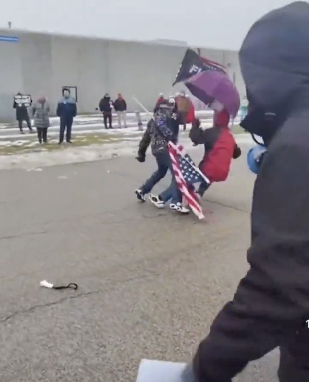 Amerikan bayrağı taşıyan karşı protestocu vatandaşın, ICE karşıtı bir gösterici tarafından kulağına devamlı şekilde megafon dayandığı kameralara yansıdı.