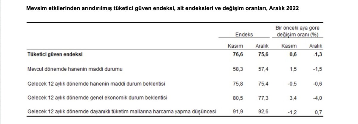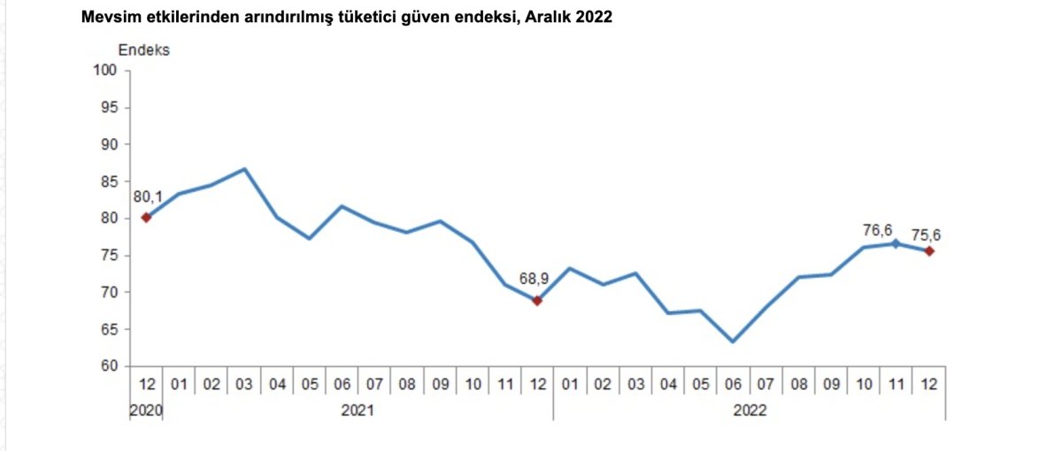 Mevsim etkilerinden arındırılmış tüketici güven endeksi, aralık ayında bir önceki aya göre yüzde 1,3 oranında azaldı; kasım ayında 76,6 olan endeks, aralık ayında 75,6 oldu.