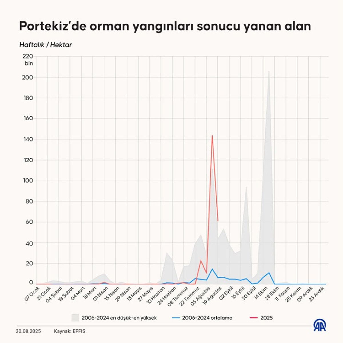 Portekiz’de söz konusu dönemde 106 bin 523 hektarlık alan kül olurken, 19 Ağustos itibarıyla toplam yanan alan miktarı 247 bin 493 hektara çıktı.