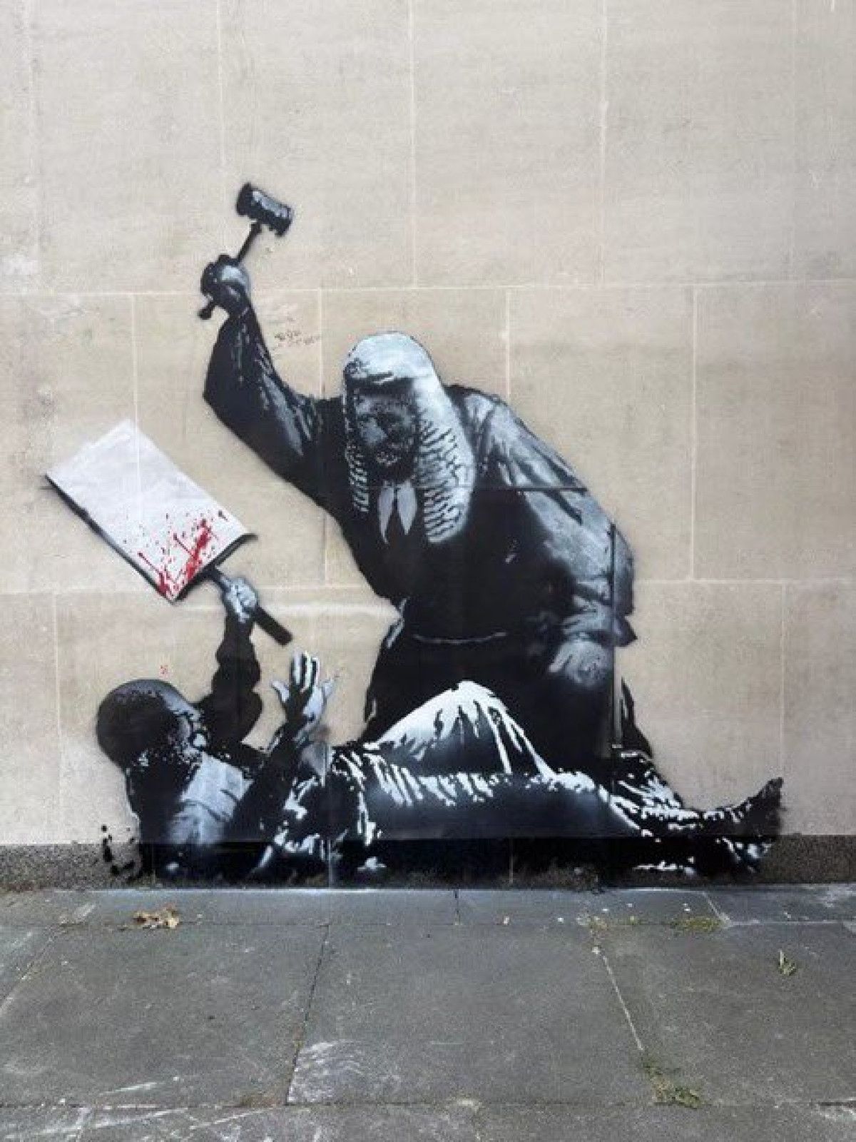 Banksy’nin yeni duvar resminde bir hakim, yerde yatan ve elinde boş pankart tutan bir eylemciye hakim tokmağıyla vurur halde resmedildi.