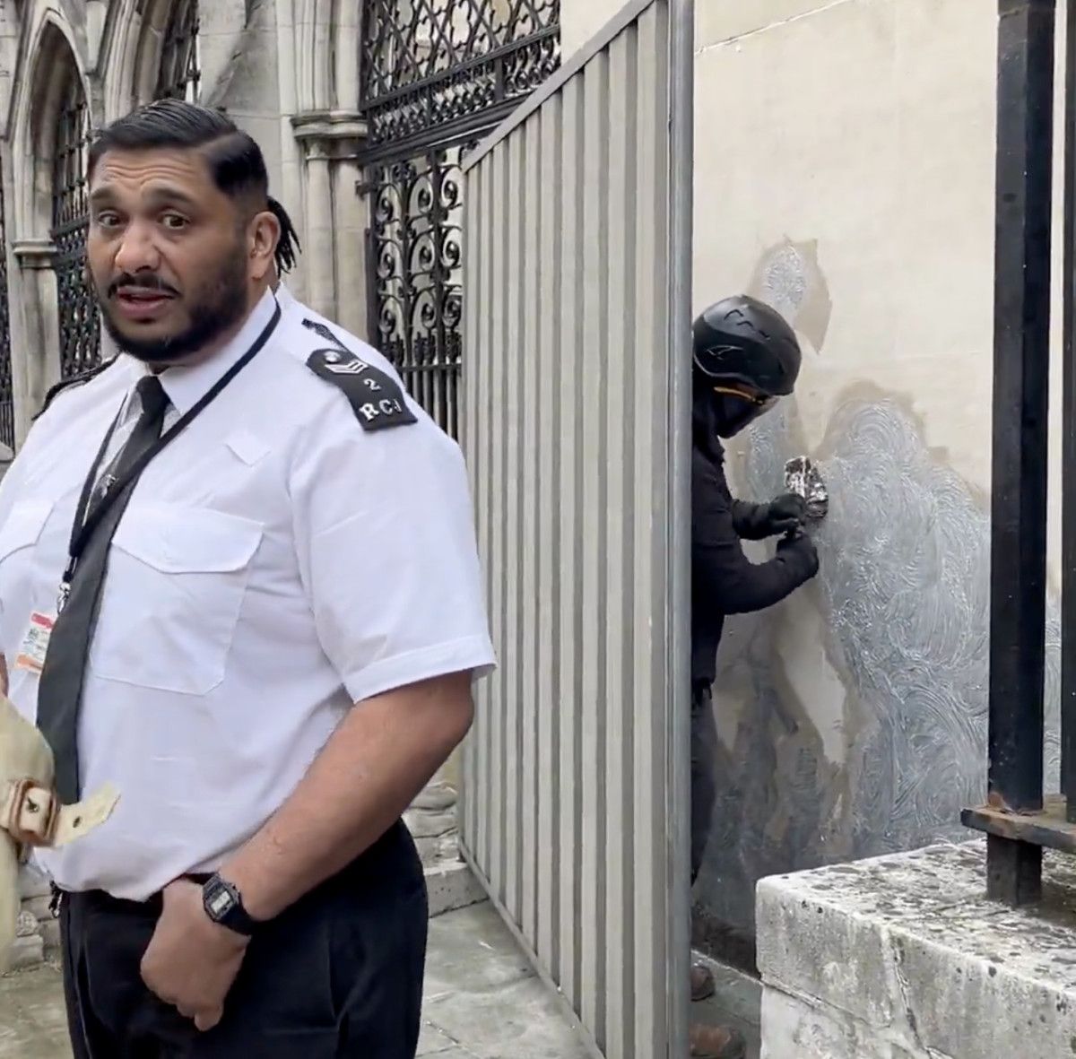 Banksy’nin resminin fark edilmesinin ardından mahkeme güvenliği, resmin önünü metal plakalarla kapattı.