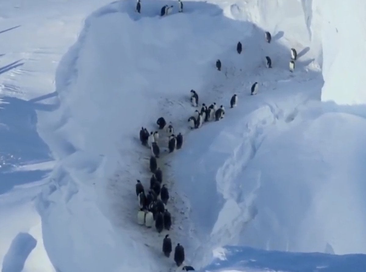 Ekip oradan uzaklaştıktan kısa bir süre sonra penguenler, belgeselcilerin açtığı bu yaşam yolunu fark etti.