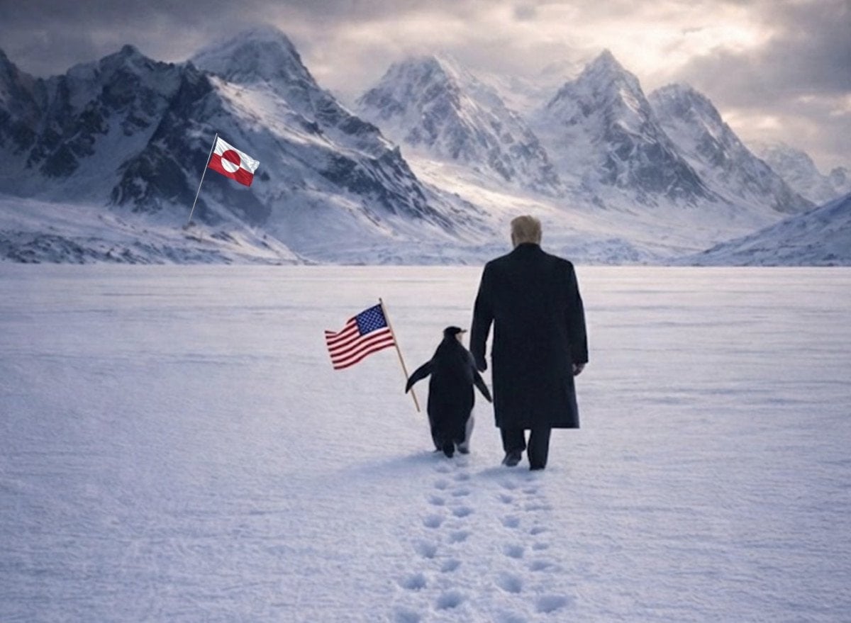 Görselde penguen ABD bayrağını taşırken, dağlarda Grönland bayrağı yer aldı ve üst mesajında “Pengueni kucakla” ifadeleri eklendi.
