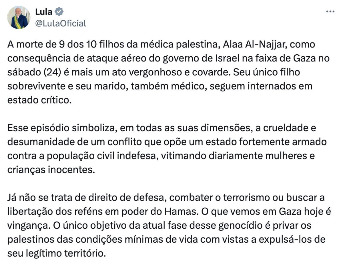 Brezilya Devlet Başkanı Luiz Inacio Lula da Silva, İsrail’in Gazze’de düzenlediği hava saldırısında 10 çocuğundan 9’unu kaybeden Filistinli kadın doktoru sosyal medya hesabında paylaşarak İsrail’e tepki gösterdi.
