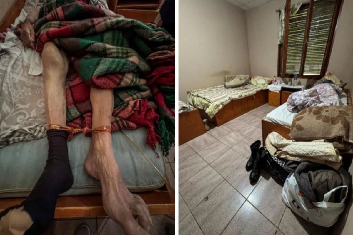 Fotoğraflarda, bakımsızlıktan zayıflamış yaşlıların ayaklarından bağlandığı, yatakların altında yatırıldığı görülüyor.