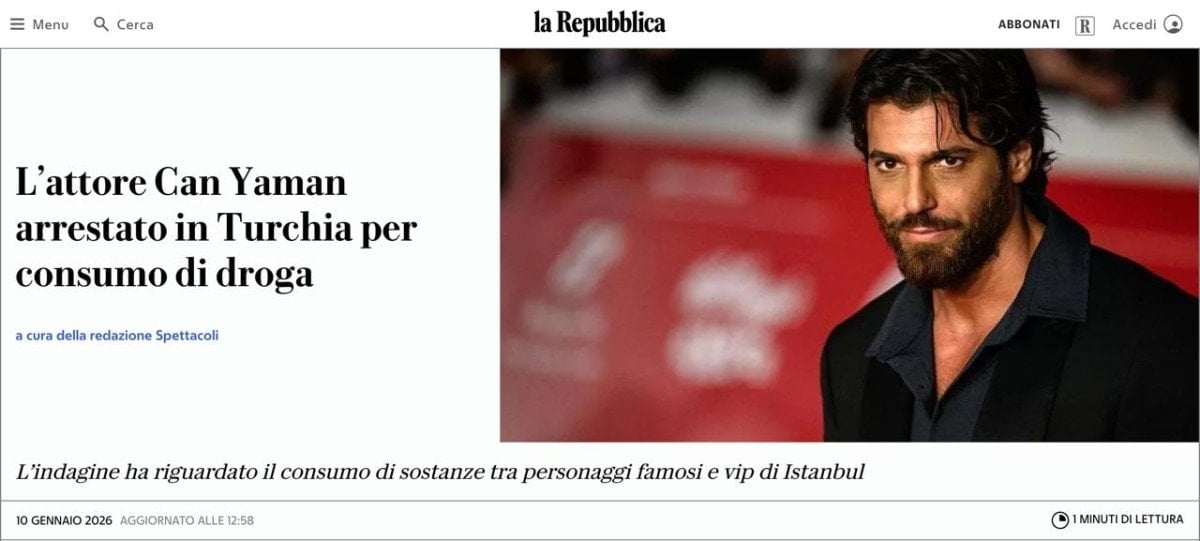 La Repubblica, “Oyuncu Can Yaman Türkiye’de uyuşturucu kullanımı nedeniyle gözaltına alındı” başlığıyla yayınladığı haberinde “İtalya’da bazı başarılı televizyon dizilerinde (Che Dio ci aiuti 6, Viola come il mare, Sandokan) başrol oynaması ve İtalyanca diline olan derin bilgisiyle (İstanbul’daki İtalyan lisesinde eğitim görmüştü) çok popüler olan Yaman, oyuncu Selen Görgüzel de dahil olmak üzere 6 kişiyle birlikte gözaltına alındı.” ifadelerine yer verdi.