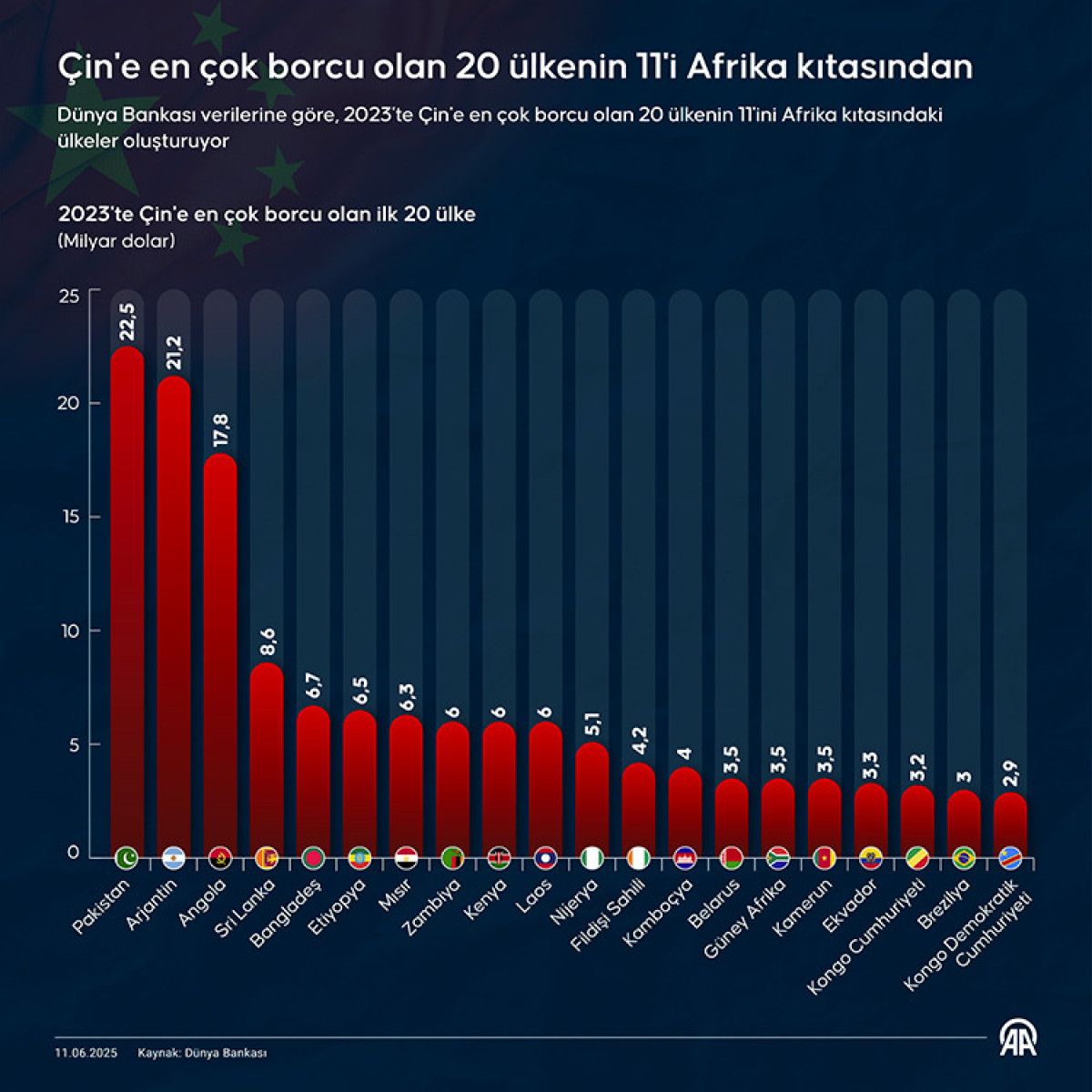 Dünya Bankası’na göre, 2023’te, Çin’e en çok borcu olan 20 ülkenin 11’ini Afrika kıtasındaki ülkeler oluşturuyor. Verilere göre, Çin’e en çok borcu olan Afrika ülkesi 17,8 milyar dolar ile Angola.