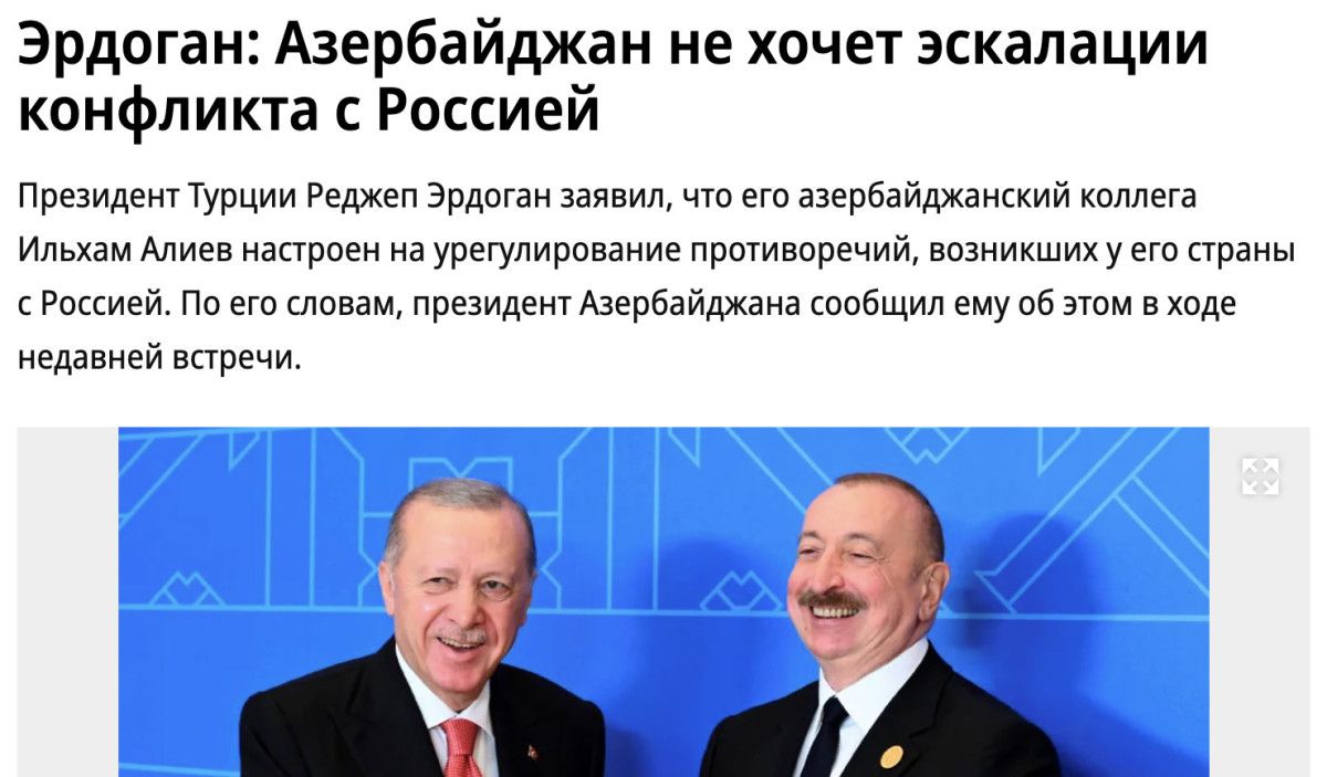 Haberde ayrıca Erdoğan’ın, “Yaşanan talihsiz hadiselerin Rusya ve Azerbaycan arasındaki ilişkilerde tamiri imkansız hasara neden olmaması en büyük arzumuzdur” sözleri öne çıkarıldı.
