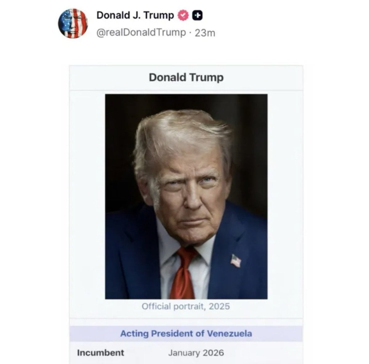 Görseldeki Trump fotoğrafının altında “Venezuela’nın Başkan Vekili” ifadesi dikkati çekti.