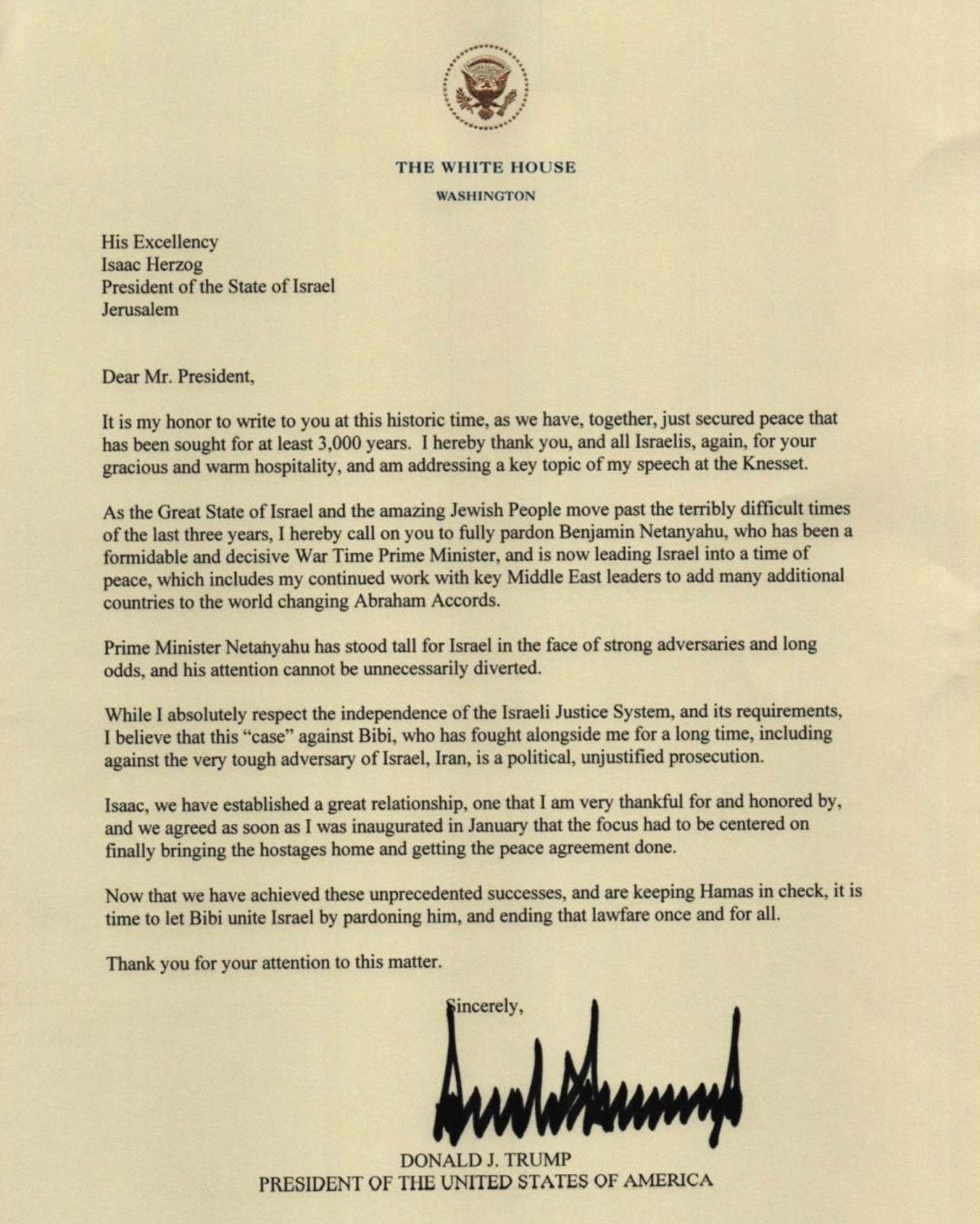 İsrail basını, Trump’ın Cumhurbaşkanı Herzog’a gönderdiği mektubu yayınladı.