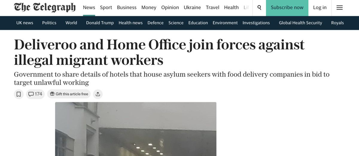 Hükümet, sığınmacıların kaldığı otellerin konum bilgilerini, yemek teslimat şirketleri Just Eat, Deliveroo ve Uber Eats ile paylaşmaya başladı. Bu sayede, bu adreslerden yasa dışı çalışanların tespiti kolaylaşacak ve firmalar, yetkisiz kişilerin hesaplarını hızla engelleyebilecek.