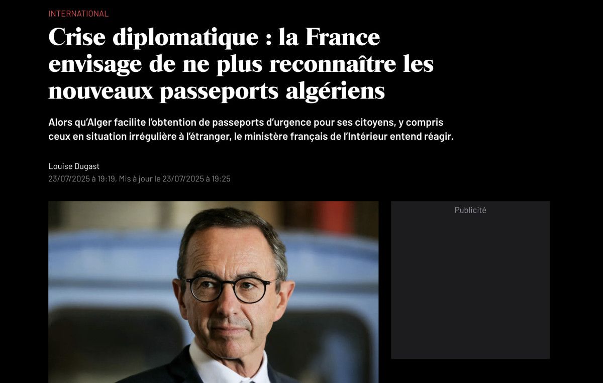 İçişleri Bakanı Retailleau, Cezayir pasaportlarının Fransa’da resmen tanınmaması yönünde kesin bir adım atılacağını açıkladı. Bu, Fransa’nın Cezayir’e karşı aldığı en sert diplomatik tavır olarak yorumlanıyorç