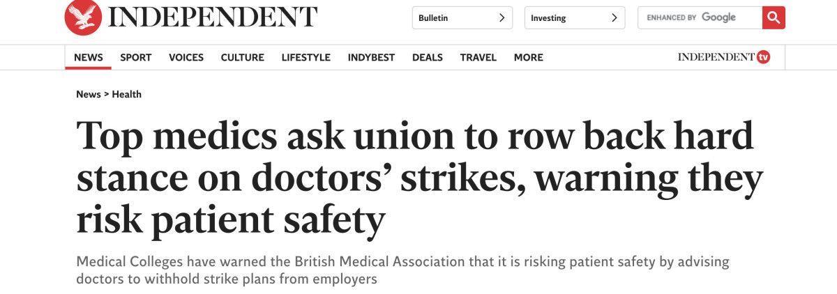 British Medical Association, doktorların greve çıkma kararını son çare olarak gördüğünü belirtirken, doktorların greve çıkacaklarını önceden hastanelere bildirmemeleri üzerine akademik tıp kurumları uyarıda bulundu. Akademi, greve çıkacak doktorların hastaneleri bilgilendirmesi gerektiğini, aksi halde hasta güvenliğinin tehlikeye gireceğini vurguladı.