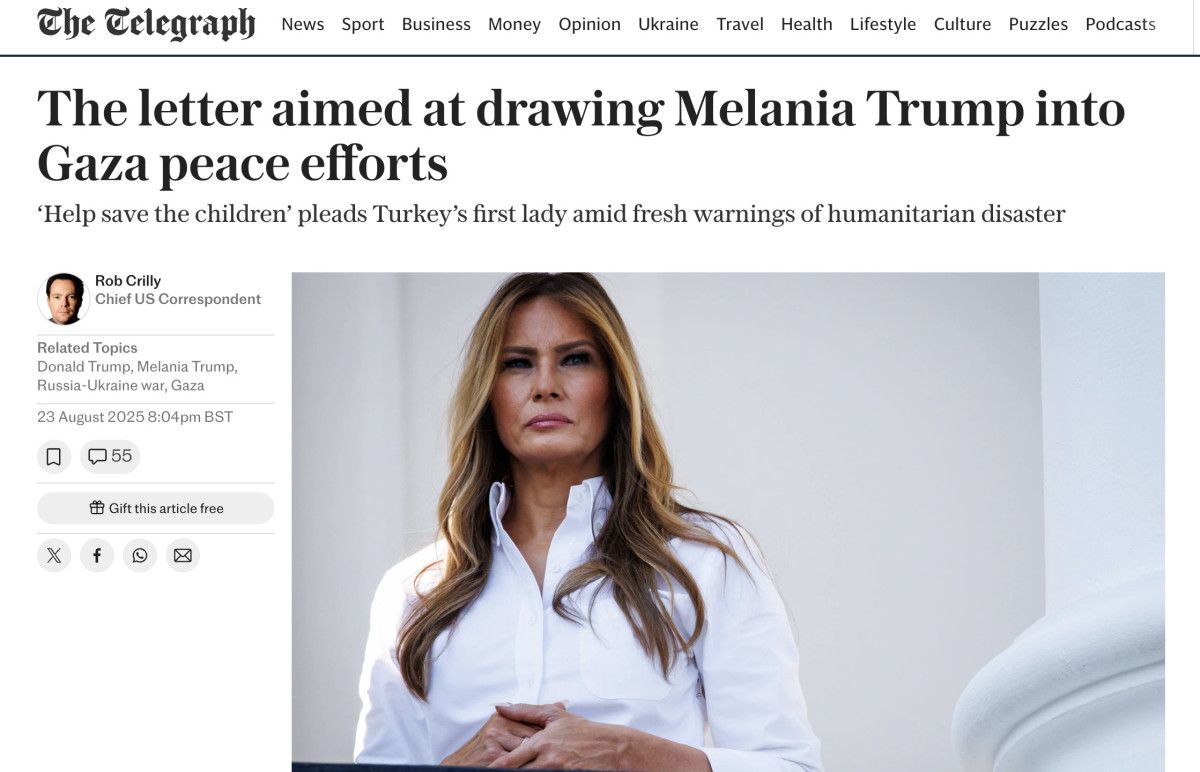 Reuters’ın haberinde haberinde, “Türkiye’nin First Lady’si, Melania Trump’ı Gazze konusunda konuşmaya çağırıyor” başlığını kullandı.