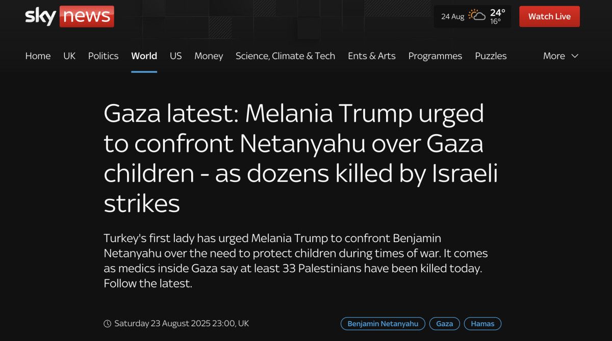 Emine Erdoğan’ın, Melania Trump’a Ukrayna’daki savaş için gösterdiği hassasiyeti Gazze’deki insani kriz için de göstermesi çağrısında bulunduğu mektup, dünya basınında birçok ajans ve haber sitesi tarafından manşetlere taşındı.