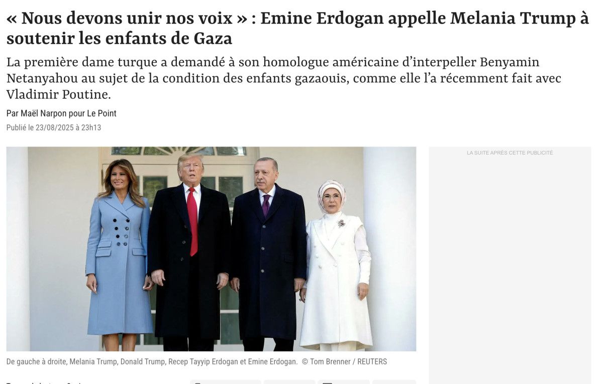 Fransız dergisi Le Point, “Seslerimizi birleştirmeliyiz: Emine Erdoğan Melania Trump’ı Gazze’nin çocuklarını desteklemeye çağırdı” başlığıyla verdiği haberde, Erdoğan’ın, Trump’tan İsrail Başbakanı Binyamin Netanyahu ile Gazze’deki çocukların durumu hakkında görüşmesini istediğini belirtti.