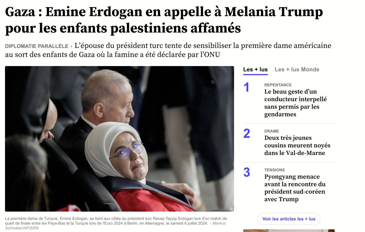 Fransız 20 minutes gazetesi, “Gazze: Emine Erdoğan, Melania Trump’a aç bırakılan Filistinli çocuklar için çağrı yaptı” başlıklı haberinde, Erdoğan’ın Trump’ın Netanyahu’ya da bir mektup göndermesini istediği ve bunun “Filistin halkı için tarihi bir sorumluluk” olduğunu hatırlattığı kaydedildi.