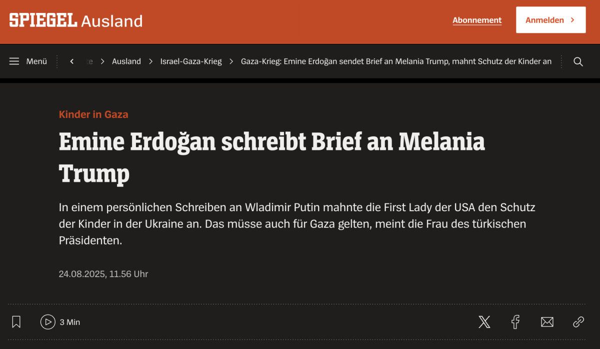 Alman NTV kanalının çevrim içi haber portalı “Erdoğan’ın eşi Melania Trump’a duygusal mektup yazdı” başlığıyla duyurduğu haberde, Erdoğan’ın Trump’a Gazzeli çocuklar için de duyarlılık göstermesi çağrısında bulunduğu belirtildi.
