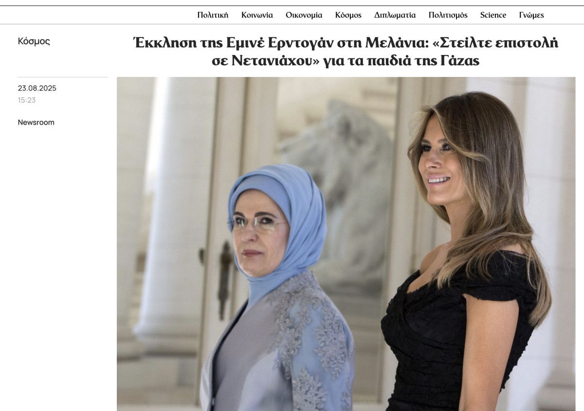 To Vima gazetesi haberi, “Emine Erdoğan’ın Melania’dan isteği” başlığıyla verirken Erdoğan’ın, Trump’tan Ukraynalı çocuklar için gösterdiği hassasiyeti Filistinli çocuklar için de göstermesini istediği vurgulandı.