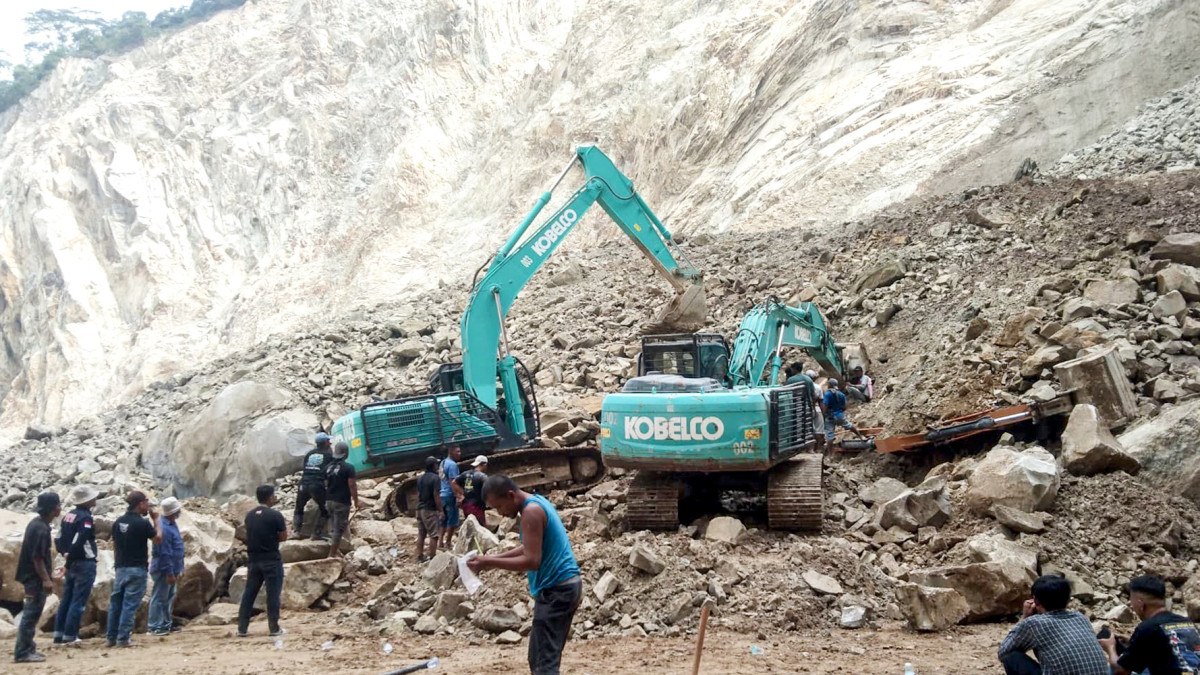 Düşen dev kayaların altında kalan işçileri kurtarmak için arama-kurtarma ekiplerinin bölgede yoğun çaba harcadığı bildirildi.