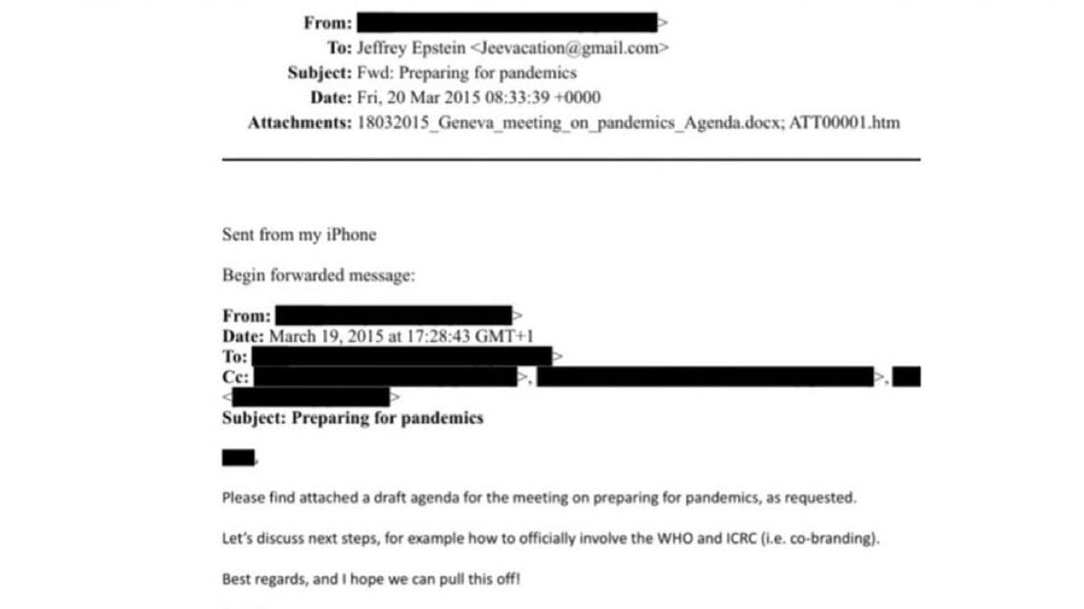Epstein’e gönderilen mailde “Talep edildiği üzere, pandemilere hazırlık konulu toplantı için taslak bir gündemi ekte bulabilirsiniz.” denilerek, Epstein tarafından bu konuyla ilgili bir talep olduğu belirtiliyorken, mailin devamında, “Örneğin DSÖ (WHO) ve ICRC’nin (yani ortak markalama/co-branding yoluyla) sürece resmi olarak nasıl dahil edileceği gibi bir sonraki adımları konuşalım. Saygılarımla, umarım bunu başarabiliriz!” cümleleriyle mail sona eriyor.