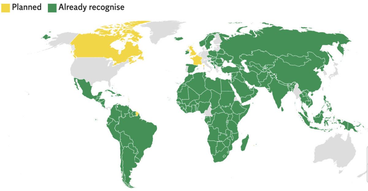 (Yeşil işaretli ülkeler, Filistin devletini güncel olarak tanıyor. Sarı işaretli ülkeler ise kısa süre içinde tanıyacaklarını açıkladı.)