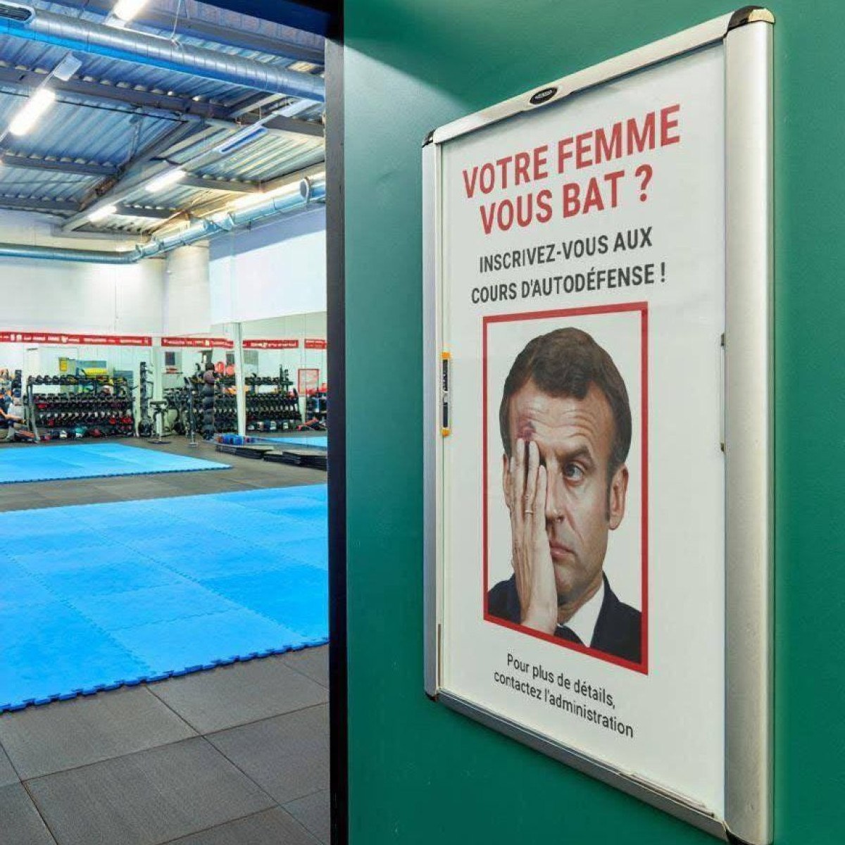 Macron’un görselinin yer aldığı afişte, “Karınız sizi dövüyor mu? Kendini savunma derslerimize katılın!” sloganı dikkat çekti.