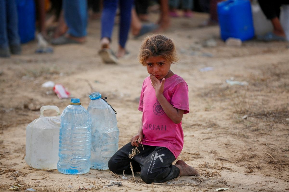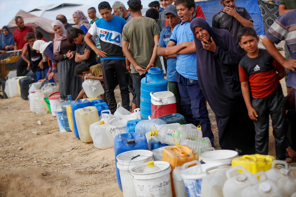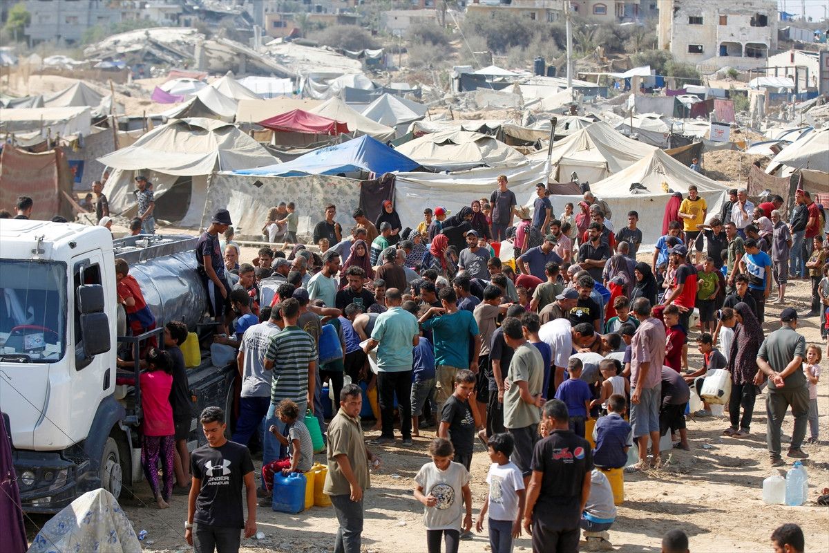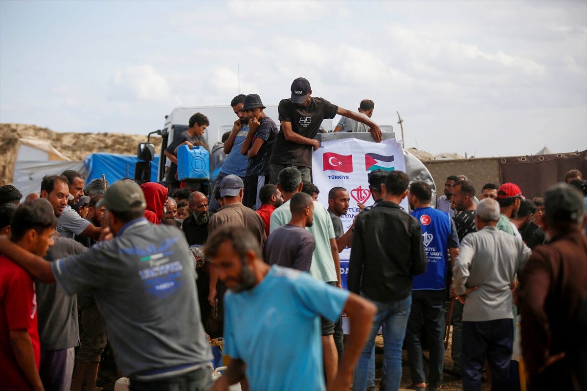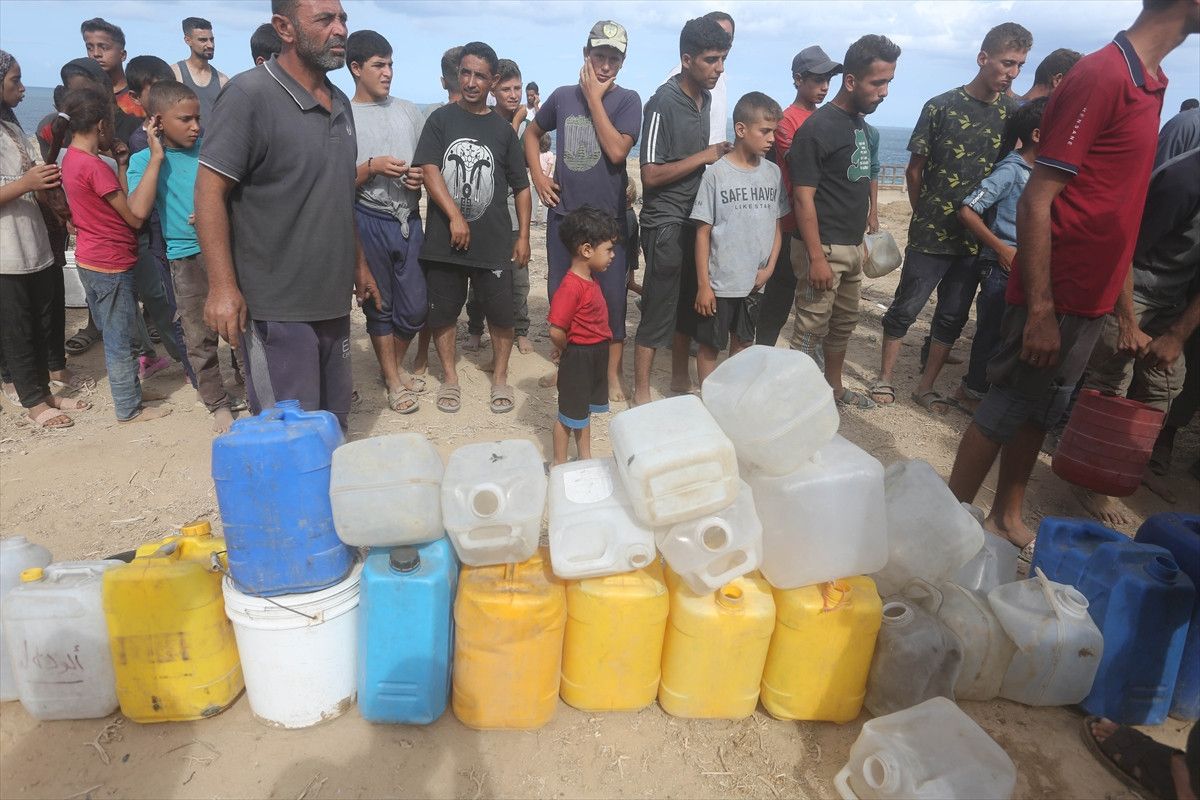 Yerinden edilen siviller, Gazze’nin orta kesiminde yer alan Nuseyrat Kampı’nda bir yardım kuruluşuna ait tankerlerden su alabilmek için kuyruğa girdi.