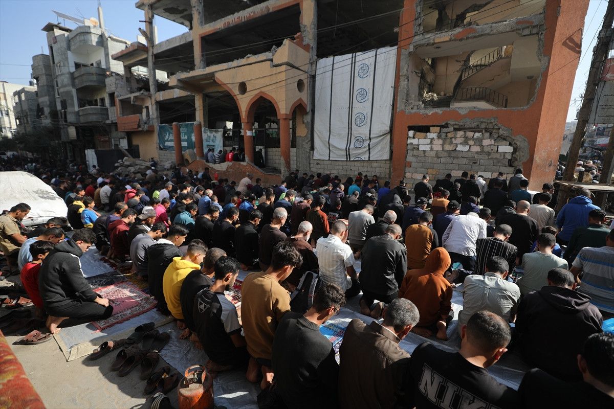 İsrail ordusunun ateşkesin ardından çekildiği Gazze Şeridi’nin orta kesiminde yer alan Nuseyrat Mülteci Kampı’nda cuma namazı kılındı.