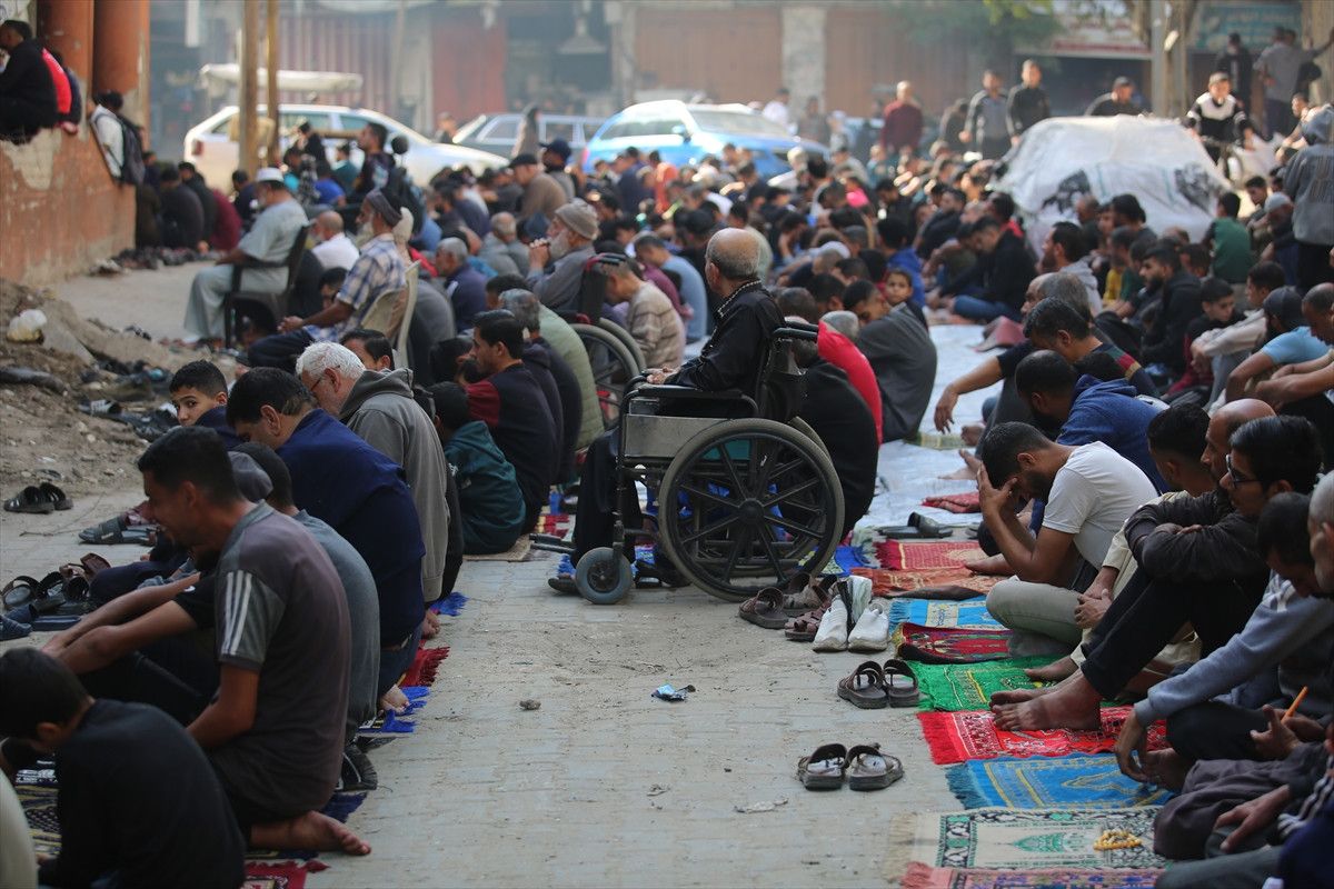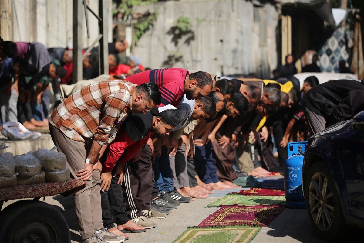 Filistinliler, İsrail saldırıları sonucu hasar gören Faruk Camii’nde ve çevresinde saf tuttu.